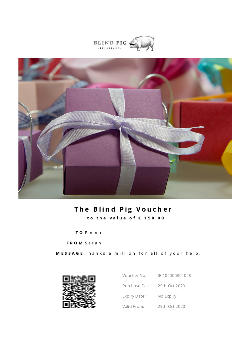 The Blind Pig allows you to purchase instantly printable gift vouchers, special offers and tickets using the Voucher Connect platform.